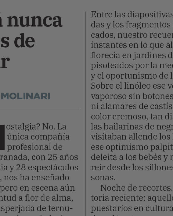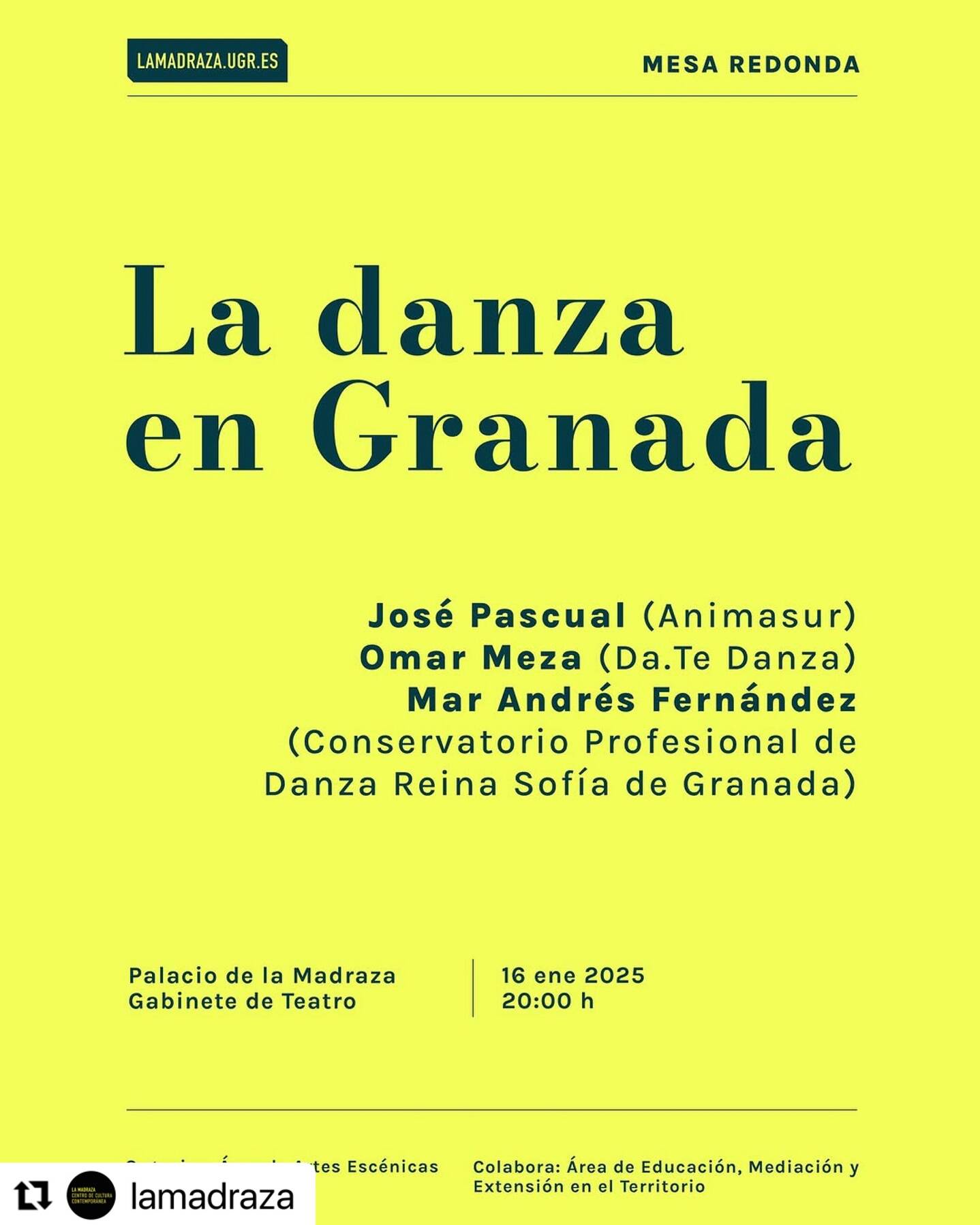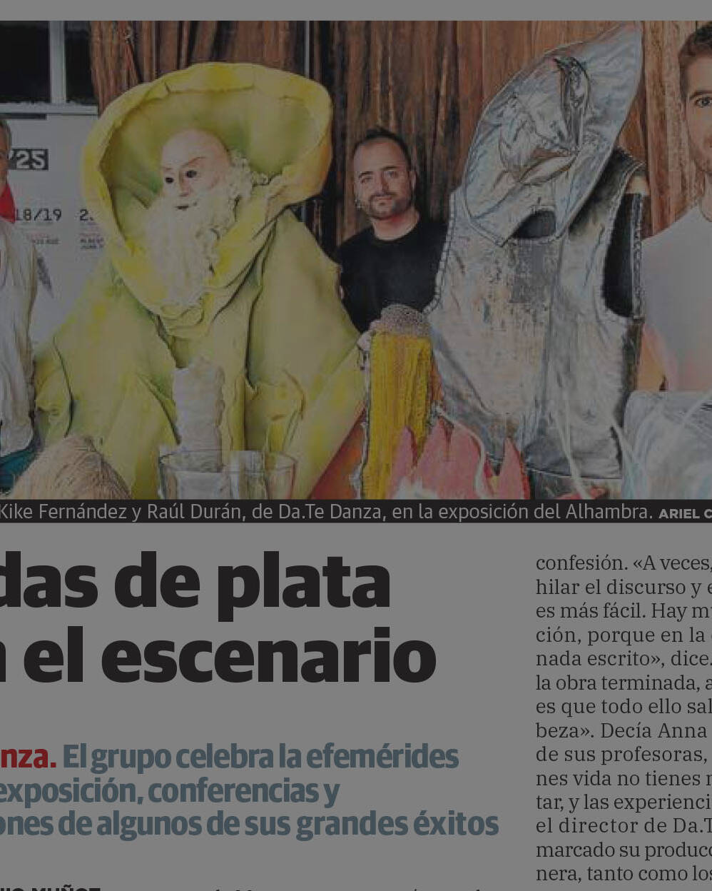 Uncategorized 16 enero, 2025Mesa Redonda «La Danza en Granada» Uncategorized 18 diciembre, 2024DATE Danza, Premio PAD 2024 Uncategorized 28 noviembre, 2024El Silencio de los Cuerpos en el marco de las Jornadas de Adolescencia de la FGUMA Uncategorized 27 noviembre, 2024Participación en las III Jornadas de Investigación en Danza del CSDD Ángel Pericet de Málaga Uncategorized 19 noviembre, 2024Participación en el Fest. Int. elPetit 2024 Uncategorized 14 noviembre, 2024Ojalá nunca dejéis de bailar por Andrés Molinari – XXV Aniversario Uncategorized 9 noviembre, 2024Bodas de plata con el escenario, por José Antonio Muñoz Uncategorized 8 noviembre, 2024Primeras funciones escolares en el Teatro Alhambra / XXV Aniversario